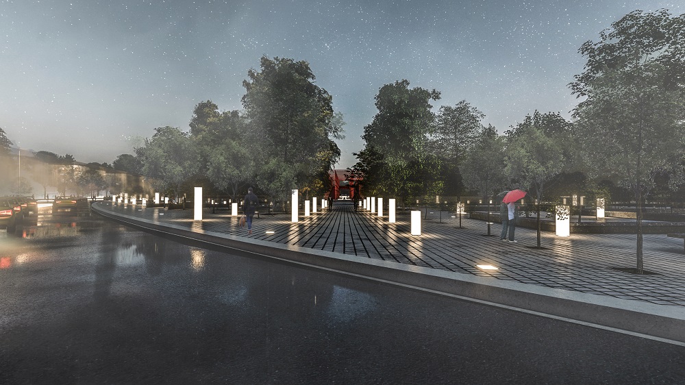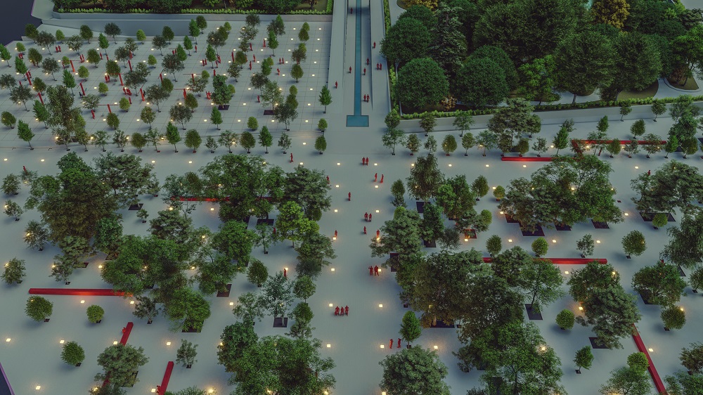 We extended the main axis starting from the center of the "Garden of flowers" to Bozorgmehr Sq. and the second axis perpendicular to the first one, from the Moshtagh Av. to the edge of Zayandehrood. The main axis is the starting point for the 6x6 grid which organizes all the 20-0 cm (diameter) trees and twenty percent of the 50-20 cm (diameter) trees. Another 6x6 grid generates by moving the main grid 3 meters in 2 directions and organizes the lights on the ground.