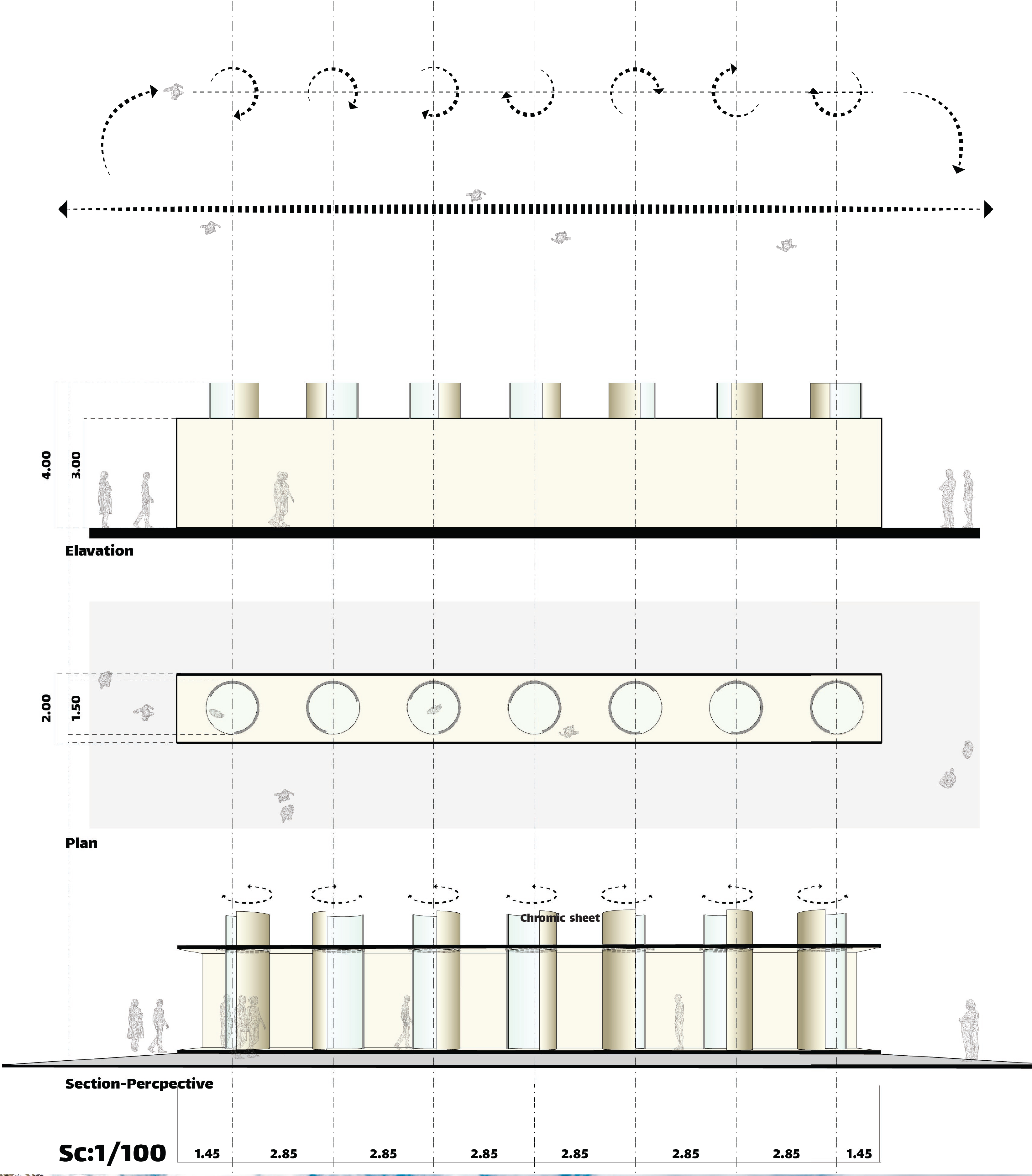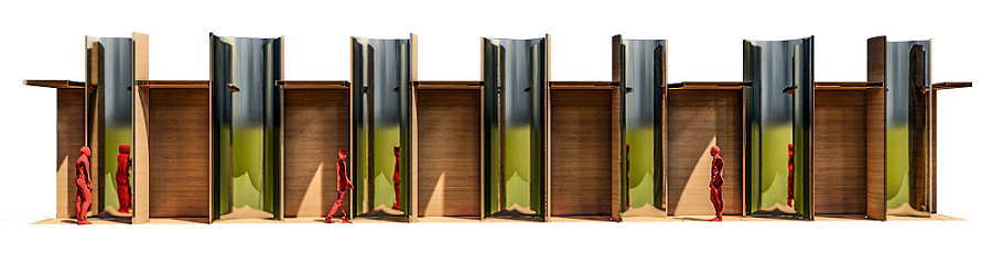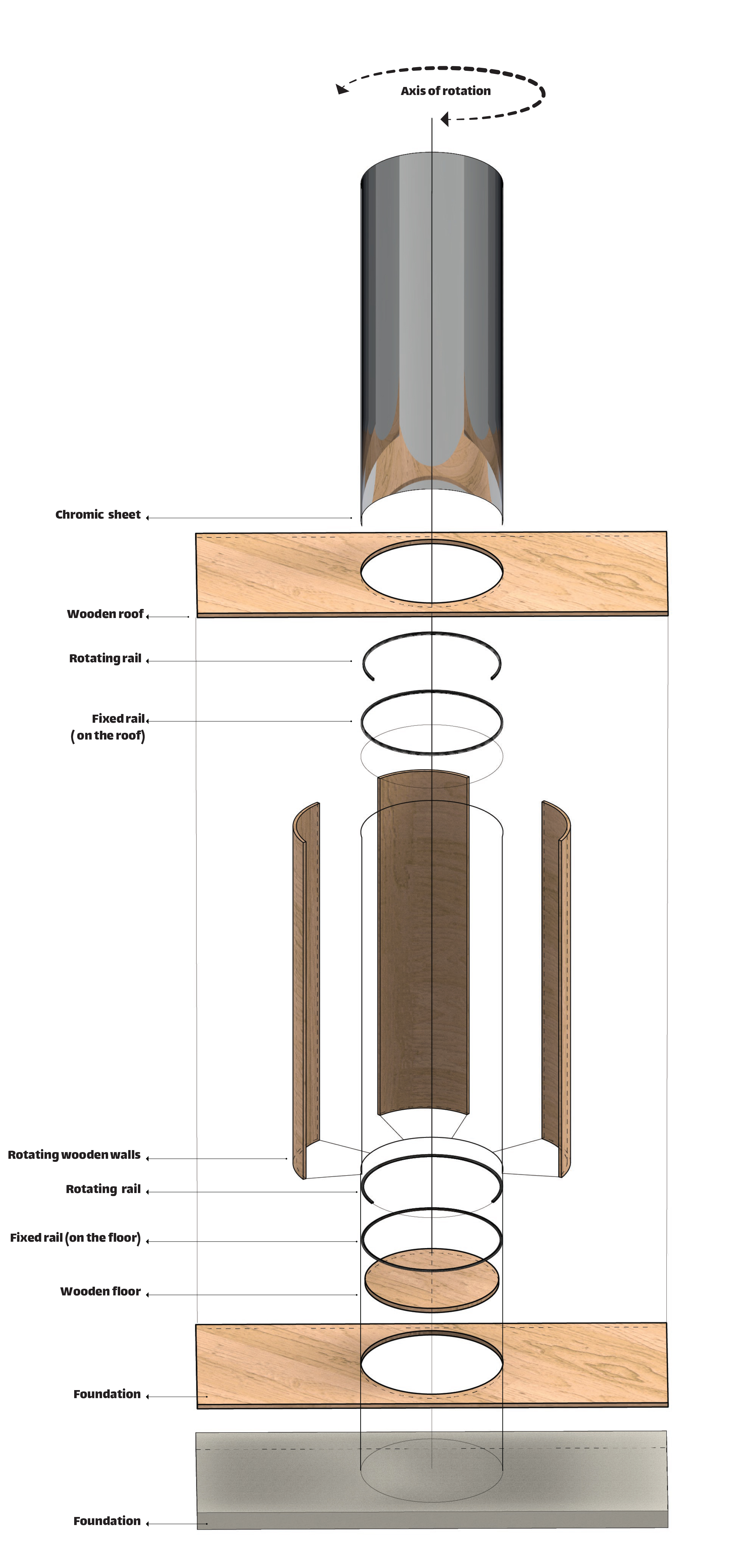 How can we perceive nature and its value without actually seeing it? In this area, we put a box in the middle of nature deprived of nature. A couple of vertical and rotating walls block the path to the other side. Visitors should spin the walls to find their way out. These walls are mirrors inside. As the visitors swirl them, they reflect an imaginative picture of inside and outside the box simultaneously, the emptiness and nature, different spatial qualities, and light plays. The wooden facade is in contrast to nature.