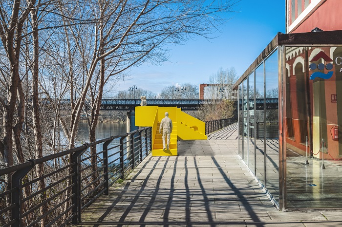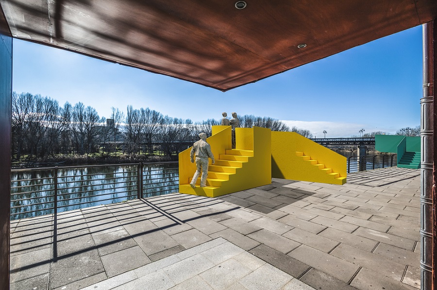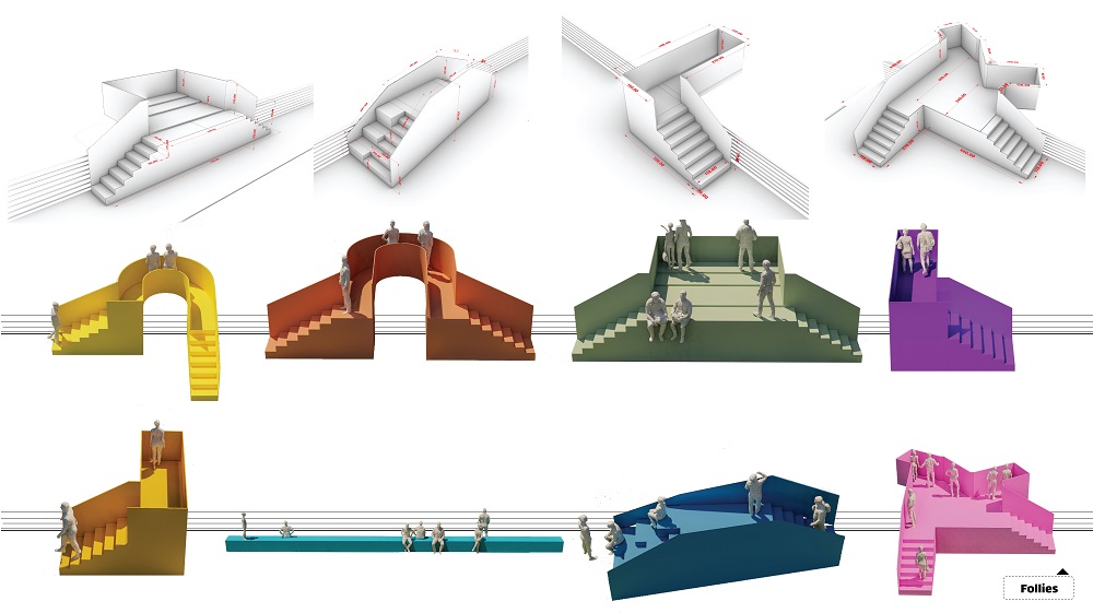 The bank of the river is the land alongside a body of water. What if the bank of the river was not just a line? What if it was a series of points? What if those points came in different shapes? We added a series of follies (points) to the existing Ebro bank. Some are just decks, making it possible to wait and enjoy the scenery from an upper level that was not possible before. Some are little extensions to the path, extending and moving the bank to a new level and bringing it back again along the way. The follies don't come in a particular shape or with instruction, but they add new spatial qualities to the area and let the visitors decide what to do with and on the new additional surfaces.