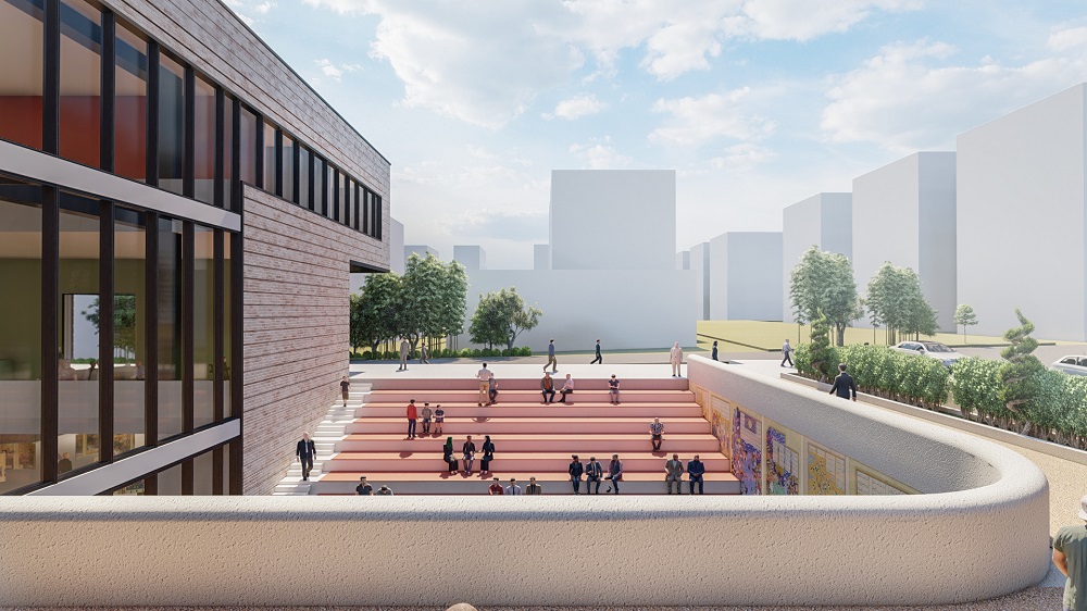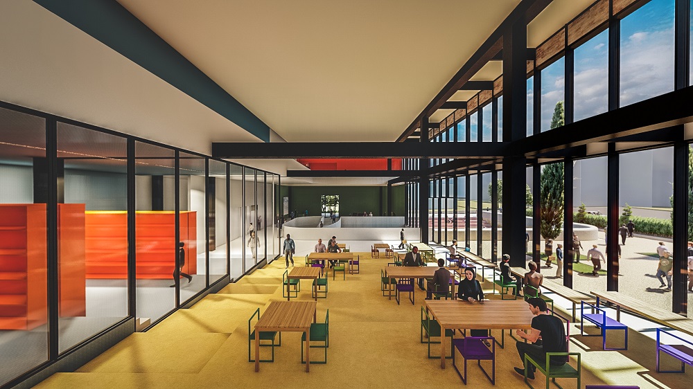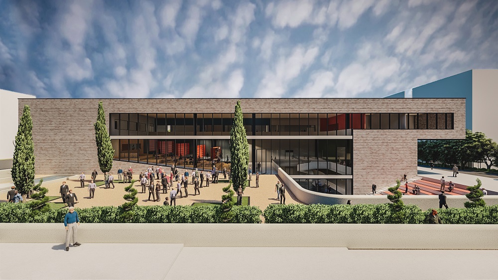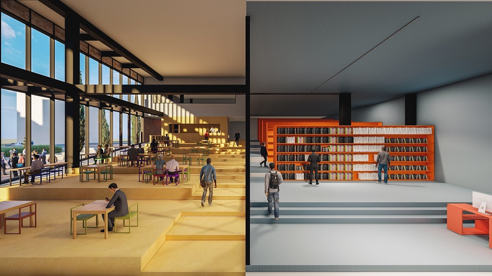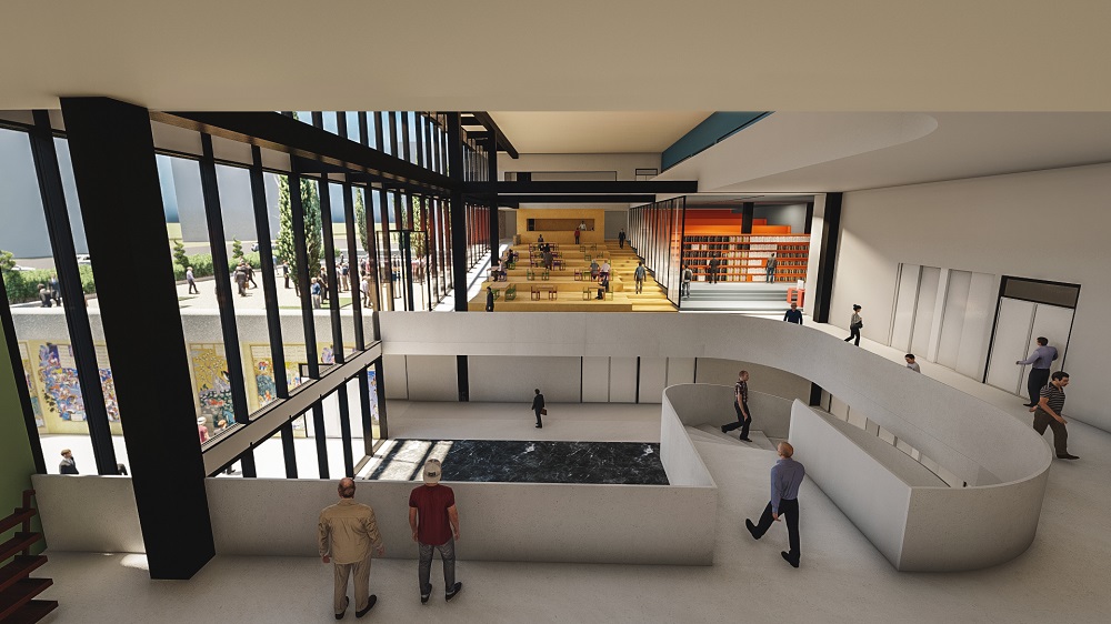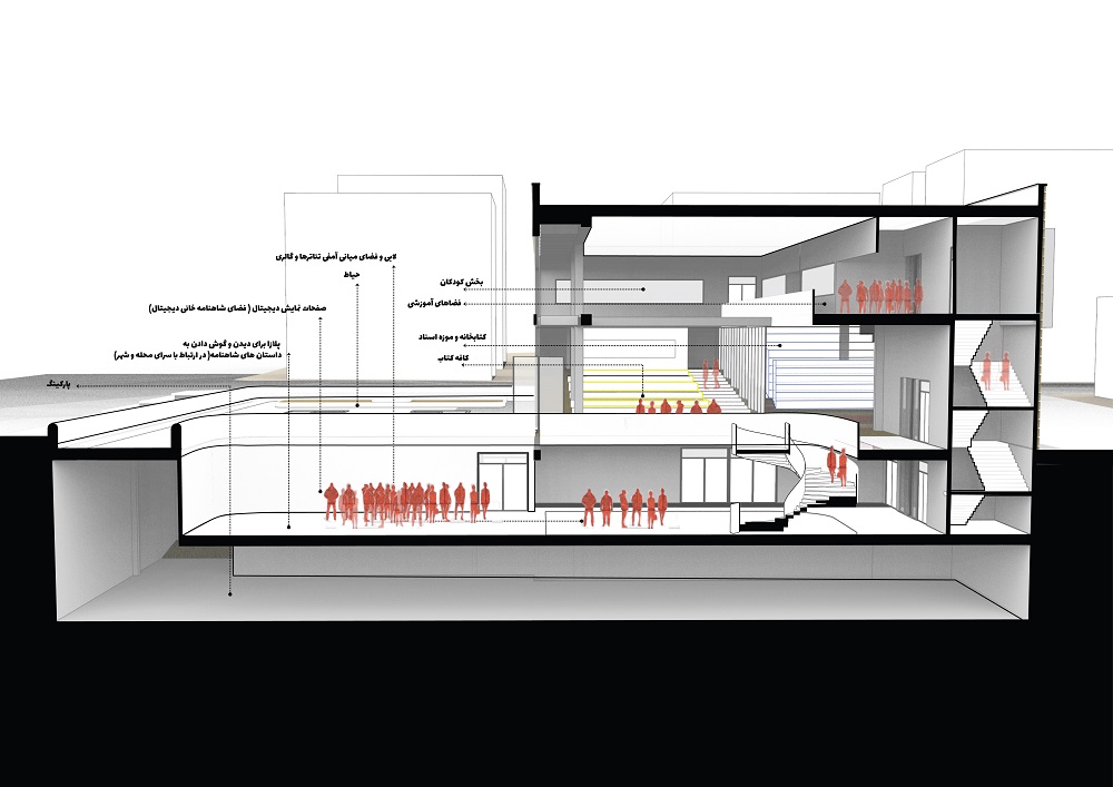 پس از خوانش شهر و محل، پروژه از نظر ما باید به عنوان مقصدی برای اعضای ثابت محل، برای رویدادهای خردسرا و همچنین واسطی در جهت آشنایی و پیوند اهالی محل با فرهنگ و شاهنامه عمل کند. حجمی کلی از سمت جنوب و جنوب شرفی در ارتباط حداکثری با شهر قرار دارد. فضای باز و جلوخوان در امتداد زون تجاری محدوده و پلازا، هم پیوند و در امتداد سرای محل قرار دارد و گستره فعالیتهای محل را امکانپذیر میسازد. کشیدگی شرقی-غربی پروژه و جهتگیری رو به جنوب تودهی پروژه، از تمسیرگیریهای مهم آن است. درنتیجه، بدنۀ شفاف ساختمان تماماً در راستای فضای باز و رو به جنوب شکل گرفته است.