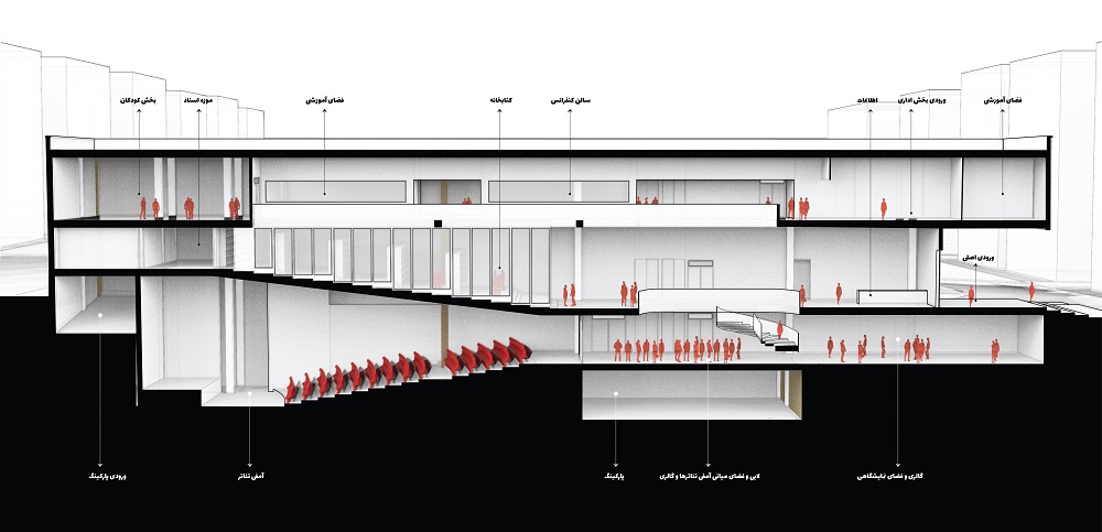 Kheradsara is both a destination for members and home to various events. We believe it should serve as a connection between the locals, Shahnameh, and culture. The volume is transparent on the southern side, while a horizontal void transforms into a yard—turning closed spaces into semi-open or open ones. The lobby at the bottom of the void connects the amphitheaters to the gallery and yard.